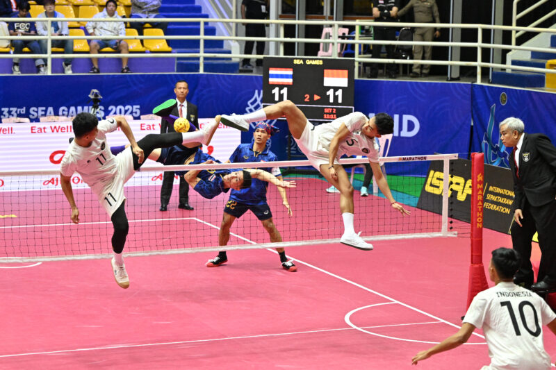 การแข่งขันตะกร้อทีมชุดชาย รอบแรก กลุ่มบี กีฬาซีเกมส์ ครั้งที่ 33 ที่สนามโรงยิมเนเซียม 4,000 ที่นั่ง ศูนย์กีฬาเทศบาลนครนครปฐม ทีมไทยลงเล่นนัดสุดท้ายพบกับอินโดนีเซีย
