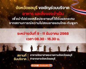 สิ่งของบรรเทาทุกข์เหล่านี้ เป็น”พลังน้ำใจอันยิ่งใหญ่”จากพี่น้องประชาชนชาวชลบุรีทุกคนที่ร่วมกันบริจาคอย่างไม่ขาดสายไม่ว่าจะเป็นข้าวสาร อาหารแห้งเครื่องนุ่งห่มยารักษาโรคและสิ่งของจำเป็นอื่นๆตลอดระยะเวลาที่เปิดรับบริจาคตั้งแต่วันที่ 9 -11 ธันวาคม 2568การหลั่งไหลของสิ่งของบริจาคนี้แสดงให้เห็นถึงความห่วงใยและความเป็นน้ำหนึ่งใจเดียวของคนชลบุรีที่พร้อมจะยื่นมือช่วยเหลือเพื่อนร่วมชาติในยามวิกฤต โดยขณะนี้ทางจังหวัดได้ดำเนินการปิดรับการบริจาคอย่างเป็นทางการแล้วเนื่องจากปริมาณสิ่งของที่ได้รับมีจำนวนมากเกินความคาดหมายและรถบรรทุกสิ่งของบริจาคกำลังมุ่งหน้าสู่ศรีสะเกษ เพื่อนำสิ่งของทั้งหมดไปส่งมอบที่ศูนย์อพยพในจังหวัดศรีสะเกษ เพื่อกระจายความช่วยเหลือไปยังผู้ประสบภัยโดยเร็วที่สุด