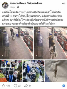 โดยทางคนที่รู้จักกับผู้เสียหายได้นำคลิปกล้องวงจรปิด และ ภาพผู้ต้องสงสัยทั้ง 2 คน มาโพสต์ในเฟสบุ๊ค พร้อมกับลงข้อความว่า แม่บ้านโดนกรีดกระเป๋า มากันเป็นทีม ตลาดสำโรงเช้าวันเสาร์ที่ 13 ธันวาคม ได้ของไปหลายอย่าง แจ้งความเรียบร้อยแล้วคะ ญาติพีน้องใครก่อน เห็นชัดขนาดนี้ ตำรวจกำลังตามนะ ขอเอาของมาคืนด้วย ถ้าเงินอยากได้ก็เอาไป โดยหลังจากที่ได้โพสต์ลงไปในโลกโซเซียวก็มีผู้เข้ามาแสดงความคิดเห็นเป็นจำนวนมาก ในทิศทางว่าเคยโดนกรีดกระเป๋าในสถานที่ต่าง ๆ