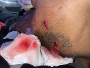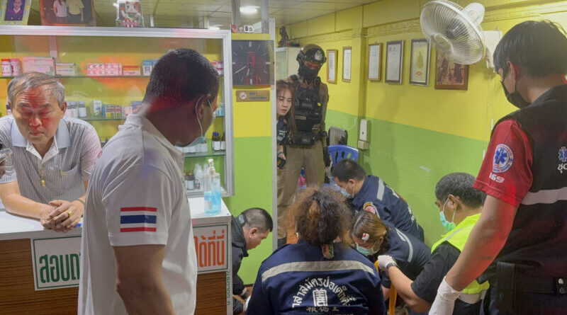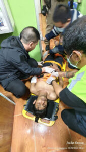 ที่เกิดเหตุภายในคลินิกเวชกรรมใกล้เคียง พบผู้ได้รับบาดเจ็บนอนร้องโอดครวญด้วยความเจ็บปวดอยู่บนพื้น ทราบชื่อต่อมาคือ นายฑีฆายุ บัวจันทร์ อายุ 25 ปี ชาวจังหวัดนครศรีธรรมราช ตรวจสอบพบบาดแผลถูกแทงด้วยอาวุธมีดบริเวณแผ่นหลัง 3 แผล และแขนซ้ายอีก 1 แผล รวมทั้งหมด 4 แผล เจ้าหน้าที่กู้ภัยจึงเร่งปฐมพยาบาลเบื้องต้น ก่อนนำตัวส่งโรงพยาบาลบางจาก ซึ่งอยู่ใกล้จุดเกิดเหตุ