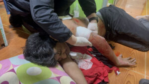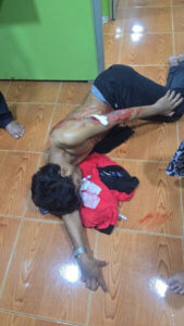 ที่เกิดเหตุภายในคลินิกเวชกรรมใกล้เคียง พบผู้ได้รับบาดเจ็บนอนร้องโอดครวญด้วยความเจ็บปวดอยู่บนพื้น ทราบชื่อต่อมาคือ นายฑีฆายุ บัวจันทร์ อายุ 25 ปี ชาวจังหวัดนครศรีธรรมราช ตรวจสอบพบบาดแผลถูกแทงด้วยอาวุธมีดบริเวณแผ่นหลัง 3 แผล และแขนซ้ายอีก 1 แผล รวมทั้งหมด 4 แผล เจ้าหน้าที่กู้ภัยจึงเร่งปฐมพยาบาลเบื้องต้น ก่อนนำตัวส่งโรงพยาบาลบางจาก ซึ่งอยู่ใกล้จุดเกิดเหตุ