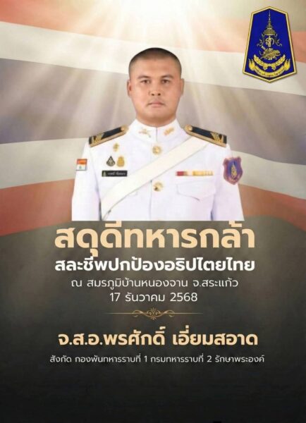 เมื่อเวลา 09.30 น.ของวันที่ 18 ธันวาคม 2568 ผู้สื่อข่าวได้ลงพื้นที่ ณ บ้านเลขที่ 58 หมู่ที่ 7 ตำบลเขาพระ จังหวัดนครนายก พบนางเตือนใจ ลามนต์ อายุ 55 ปี เป็นแม่ยายของจ.ส.อ.พรศักดิ์ เอี่ยมสะอาด ส่วนคุณชื่นกมล เอี่ยมสะอาด ภรรยา ได้ไปติดต่อทางราชการ ได้เตรียมการจัดสถานที่รับขบวนทหารกองเกียรติยศที่จะนำร่าง จ.ส.อ.พรศักดิ์ เอี่ยมสะอาด ทหารกล้า ที่ลละชีพปกป้องอธิปไตยไทย ณ สมรภูมิบ้านหนองจาน จังหวัดสระแก้ว วันที่ 17 ธันวาคม 2568 เป็นทำหาร กองพันทหารราบที่ 1 กรมทหารราบที่ 2 รัษาพระองค์ มาทำการน้ำหลวงอาบศพ ในวันที่ 18 ธันวาคม 2568 ที่บ้านเลขที่ 58 หมู่ที่ 7 ตำบลเขาพระ อำเภอเมือง จังหวัดนครนายก โดยมีหน่วยงานราชการ ทหาร ผู้นำหมู่บ้าน พี่น้องประชาชน ได้มาเตรียมความพร้อมจัดสถานที่