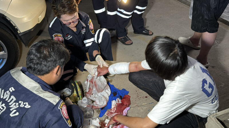 ที่เกิดเหตุพบผู้บาดเจ็บเป็นชาย อายุ 17 ปี นั่งรอการช่วยเหลืออยู่ริมถนน มีบาดแผลถูกอาวุธมีดฟันเข้าที่แขนขวา เป็นแผลฉกรรจ์ฉีกขาดขนาดใหญ่ เจ้าหน้าที่กู้ภัยเร่งปฐมพยาบาลห้ามเลือดก่อนนำส่งโรงพยาบาลใกล้เคียง