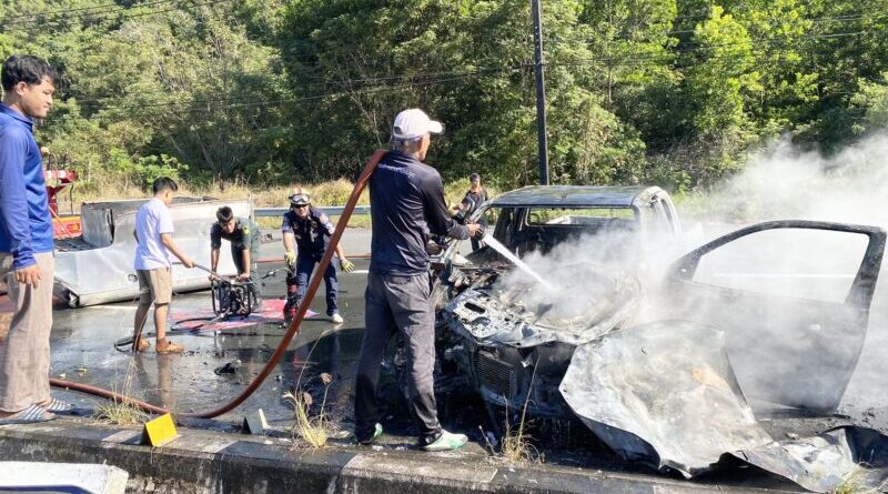 อ.คลองใหญ่ จ.ตราด หนุ่มวัย 36 หลับในกระบะชนยูเทิร์นก่อนเกิดไฟลุกท่วมทั้งคัน เสียงระเบิดดังสนั่นคนขับเจ็บ