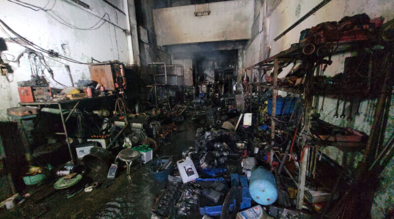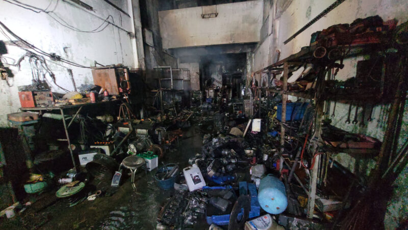 ระทึกกลางดึก! สองสามีภรรยาเจ้าของอู่ปีนดาดฟ้าหนีตาย หลังไฟไหม้อู่ซ่อมรถชั้นล่าง