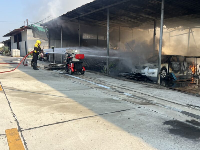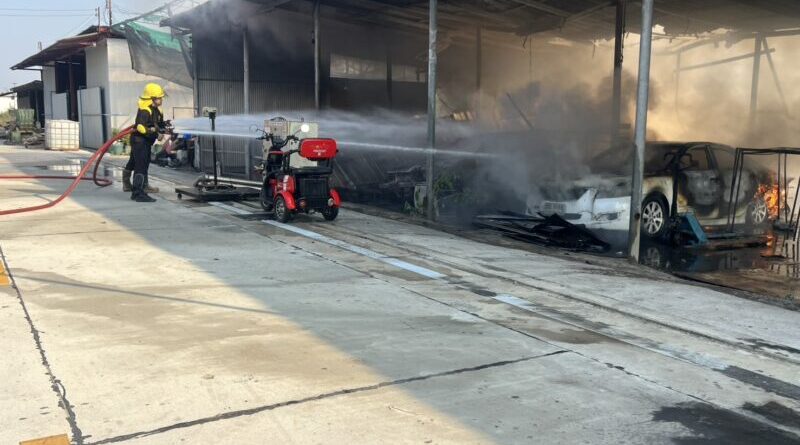 ด้านนายเตชสิทธิ์ ภู่ฉุน ปฏิบัติราชการแทนหัวหน้าฝ่ายป้องกันและบรรเทาสาธารณภัยเทศบาลเมืองท่าโขลงบอกว่าทางศูนย์ดับเพลิงเทศบาลเมืองท่าโขลงได้รับแจ้งไฟไหม้ โรงเก็บของซอยเอราวัณ34จึงได้จัดรถดับเพลิงเทศบาลเมืองท่าโขลงเข้ามาตรวจสอบที่เกิดเหตุเมื่อมาถึงก็พบว่าไฟกำลังลุกไหม้โรงเก็บของอย่างรุนแรงและรถยนต์ที่จอดอยู่ก็ถูกไฟไหม้และแบตเตอรี่ลิเธียมถูกไฟไหม้และเกิดระเบิดด้วย นอกจากนี้ยังมีผู้ได้รับบาดเจ็บเป็นชาย1 รายถูกไฟคลอกตามลำตัวเจ้าหน้าที่กู้ชีพเทศบาลเมืองท่าโขลงนำส่งโรงพยาบาลไปก่อนแล้ว