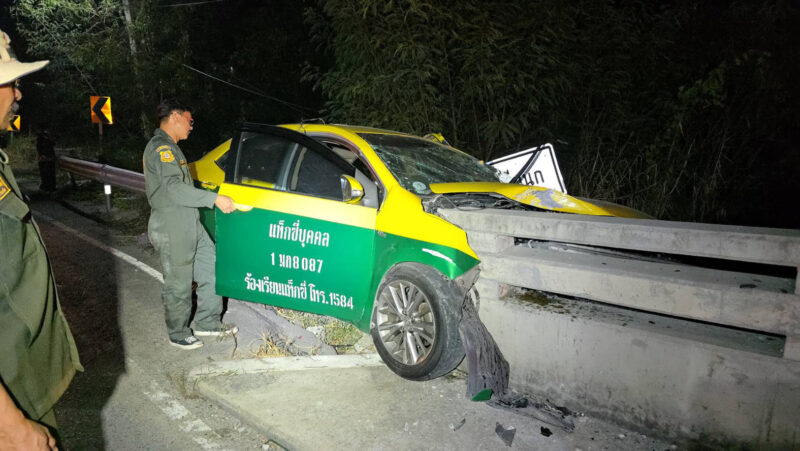 ลุงโชเฟอร์แท็กซี่ซดเหล้ายาดอง 2 กึ๊บ พาผู้โดยสารแหกโค้งชนคอสะพาน เจ็บ 3 ราย