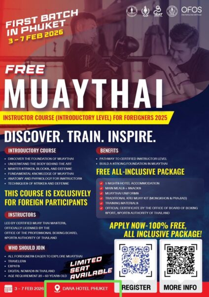 โอกาสทอง! เปิดอบรมหลักสูตร “ครูมวยไทย” ขั้นพื้นฐาน ฟรีที่ภูเก็ต รับเฉพาะชาวต่างชาติ (3-7 ก.พ. 2026)