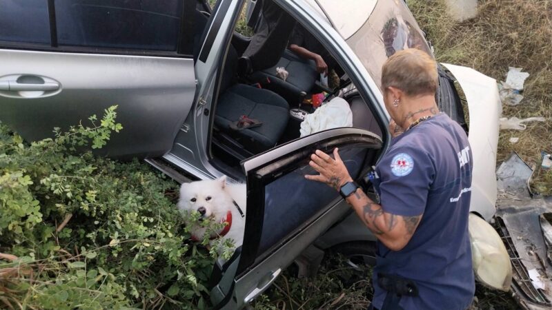 ปทุมธานีสาวขับเก๋งชนเสาไฟฟ้าสุนัขหวงเจ้าของจัดขู่กู้ภัยไม่ให้เข้าใกล้ต้องรอนาน 15 นาทีถึงช่วยได้