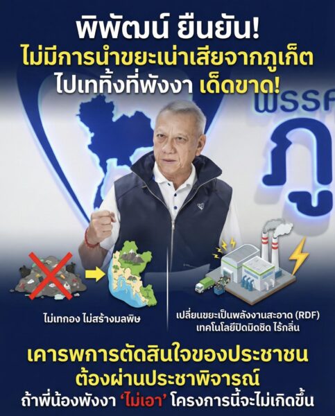 โดยนายพิพัฒน์ได้กล่าวขออภัยที่ทำให้เกิดความกังวลใจ และเข้าใจความรู้สึกของพี่น้องชาวพังงาที่รักและหวงแหนธรรมชาติในพื้นที่เป็นอย่างดี พร้อมขอ “ชี้แจงข้อเท็จจริงเชิงลึก” เพื่อความกระจ่างและความสบายใจแก่ทุกฝ่าย ดังนี้ 1. เจตนาที่สื่อสารคือการมองภาพรวมปัญหาสิ่งแวดล้อมภาคใต้ตอนบน โดยภูเก็ตกำลังเผชิญวิกฤตขยะตกค้างกว่า 1,200 ตันต่อวัน ซึ่งแนวคิดนี้ไม่ใช่การนำขยะเน่าเสียไปทิ้งเป็นภาระที่พังงา แต่เป็นการใช้ระบบ Waste to Energy (ขยะเปลี่ยนเป็นพลังงาน) ในรูปแบบการแปรรูปเป็นเชื้อเพลิง RDF หรือส่งเข้าโรงไฟฟ้าขยะมาตรฐานสากล ซึ่งเป็นเทคโนโลยีที่สะอาด ปิดมิดชิด และไม่ส่งกลิ่นรบกวน เพื่อเปลี่ยน “ของเสีย” ให้เป็น “ประโยชน์” ร่วมกันในอนาคตเท่านั้น 2. ตระหนักดีว่าพังงาคือ “เมืองท่องเที่ยวระดับโลก” ทั้งอ่าวพังงาและเขาหลัก จึงไม่มีวันยอมให้โครงการใดมาทำลายภาพลักษณ์และความสวยงามของพื้นที่ โดยจุดที่ตั้งโรงกำจัดขยะหรือโรงไฟฟ้าที่ใช้เชื้อเพลิงจากขยะ จะต้องใช้เทคโนโลยีที่สะอาด ปิดมิดชิด ได้มาตรฐานระดับโลก มีแนวคิดให้ภาคเอกชนเป็นผู้ลงทุน และขอยืนยันว่าจุดที่ตั้งโครงการจะต้องอยู่ไกลจากแหล่งชุมชนและแหล่งท่องเที่ยว เพื่อไม่ให้กระทบต่อสิ่งแวดล้อมและวิถีชีวิตประชาชน 3. แนวคิดนี้เป็นเพียง “ข้อเสนอเพื่อหาทางออก” เท่านั้น แต่ในทางปฏิบัติ หากพี่น้องชาวพังงา “ไม่เอา” โครงการนี้จะไม่มีวันเกิดขึ้น โดยจะต้องมีการทำประชาพิจารณ์อย่างถูกต้องและผ่านความเห็นชอบจากประชาชนในพื้นที่ เพราะยึดถือความต้องการของประชาชนเป็นที่ตั้ง