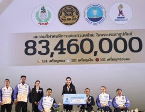 สมาคมกีฬาคนพิการทางปัญญาแห่งประเทศไทย 19 เหรียญทอง 9 เหรียญเงิน 8 เหรียญทองแดง รวม 11,755,000 บาท