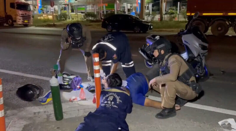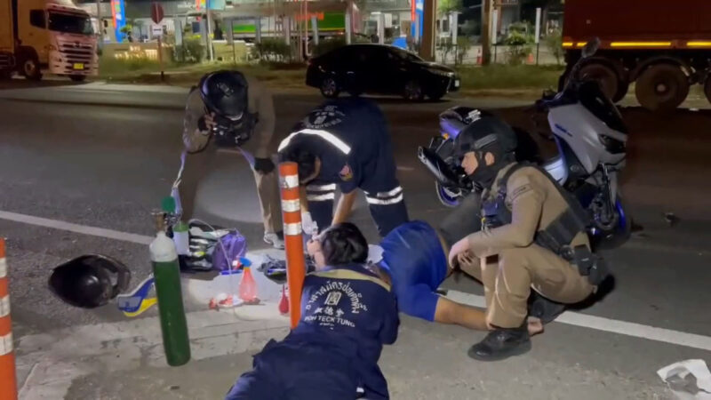 หนุ่มศรีสะเกษขี่ จยย.แหกด่านสุดท้ายจวนตัวหักชนขอบฟุตบาทพลิกคว่ำบาดเจ็บ