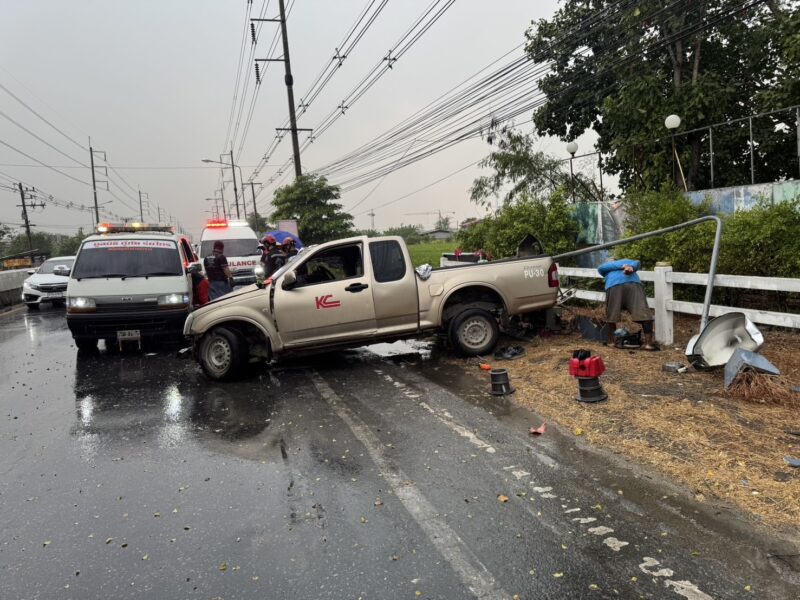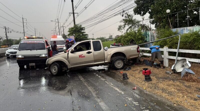 ปทุมธานี – ลุงวัย 58 ปี ขับกระบะเสียหลักชนอัดเสาไฟเหล็กเสียบคาขาคนขับกู้ภัยเร่งตัดถ่างช่วยชีวิต