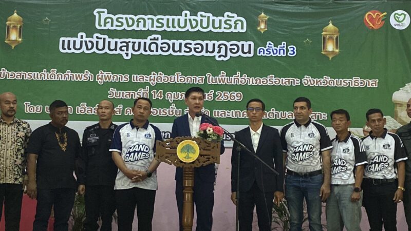 เมื่อเวลา 09.00 น. วันที่ 14 กุมภาพันธ์ 2569 ณ อาคารเอนกประสงค์ สวนกาญจนาภิเษก อ.รือเสาะ จ.นราธิวาส นายวิชาญ ชัยเศรษฐ์สัมพันธ์ รองผู้ว่าราชการจังหวัดนราธิวาส เป็นประธานในพิธีเปิดโครงการ “แบ่งปันรักแบ่งปันสุขรอมฎอน ครั้งที่ 3” โดยมี นายอัยมานน์ อับดุลลาเต๊ะ กรรมการผู้จัดการ บจก.มายฟูดคอร์ปอเรชั่น, นายธีรวุทธ์ อัศวโสภณ CEO บริษัท เฮ็ลธ์ฟู้ดคอร์ปอเรชั่น จำกัด นายอามีร ซาริคาน นายกเทศมนตรีตำบลรือเสาะ พร้อมด้วยผู้นำศาสนา ผู้นำท้องถิ่นและประชาชนในพื้นที่เข้าร่วมอย่างคับคั่ง