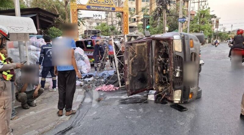 รถกระบะบรรทุกเศษผ้าพลิกคว่ำกลางถนนพุทธบูชา โชคดีไร้ผู้บาดเจ็บ