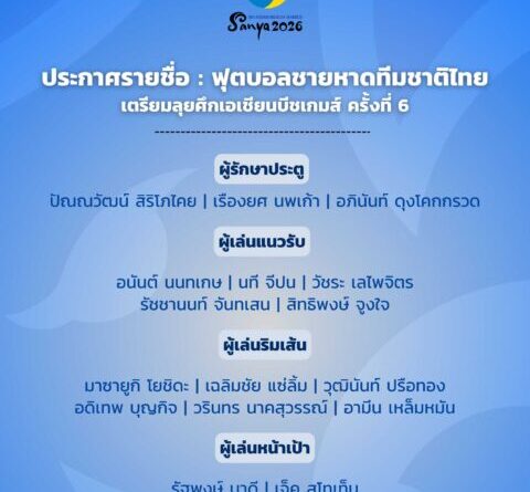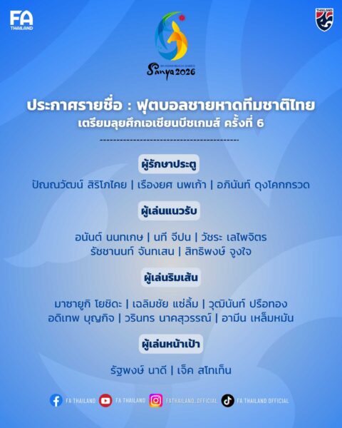 สมาคมกีฬาฟุตบอลแห่งประเทศไทยฯ ประกาศรายชื่อ 16 นักฟุตบอลชายหาดทีมชาติไทย ชุดเตรียมเข้าร่วมการแข่งขันกีฬา “เอเชียน บีช เกมส์ ครั้งที่ 6” ณ เมืองซานย่า สาธารณรัฐประชาชนจีน ซึ่งจะแข่งขันระหว่างวันที่ 22–30 เมษายน 2569