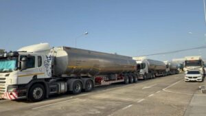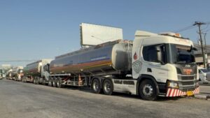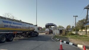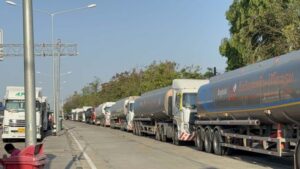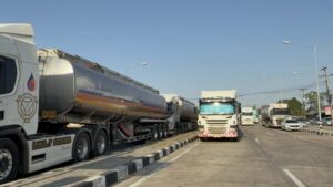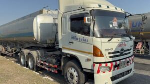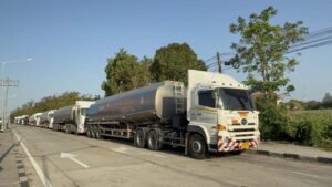 คนขับรถบรรทุกน้ำมัน ( ใส่เสื้อสีเทา อยู่บนรถ ) กล่าวว่า มาจากโรงกลั่นน้ำมันบางจาก ชลบุรี บรรทุกมา 40,000 ลิตร เป็นน้ำมันดีเซล ได้รับผลกระทบจากสงครามคือ ได้วิ่งเที่ยวน้อยลงครึ่งต่อครึ่ง ส่งผลต่อการดำรงชีพมาก ค่าใช้จ่ายกับรายได้ไม่เท่ากัน.