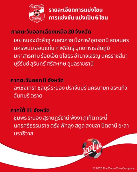 ศึกฟุตบอล Coke Cup U-17 THAILAND CHAMPIONSHIP 2026 กลับมาระเบิดความมันส์อีกครั้ง ทั่วทุกภูมิภาคของประเทศไทย โดยรอบภูมิภาค จะแบ่งออกเป็น 6 โซน ดังนี้