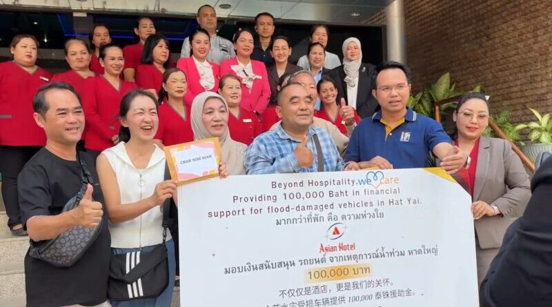 โรงแรมเอเชี่ยนหาดใหญ่ มอบเงินเยียวยานักท่องเที่ยวมาเลเซีย 2 แสนบาท หลังรถจมน้ำท่วมใหญ่เมื่อวันที่ 27 มีนาคม 2569 นายสมบูรณ์ พงศ์เลิศนภากร เจ้าของโรงแรมเอเชี่ยน พร้อมด้วย ดร.สิทธิพงษ์ สิทธิภัทรประภา นายกสมาคมโรงแรมหาดใหญ่ สงขลา ร่วมเป็นสักขีพยานในการมอบเงินสนับสนุนช่วยเหลือเยียวยานักท่องเที่ยวชาวมาเลเซีย จำนวน 2 ราย ที่ประสบอุบัติภัยรถยนต์จมน้ำจากเหตุการณ์น้ำท่วมใหญ่หาดใหญ่เมื่อช่วงปลายปีที่ผ่านมา เป็นเงินรวม 200,000 บาท (คันละ 100,000 บาท) ณ โรงแรมเอเชี่ยน ถนนนิพัทธ์อุทิศ 3 อ.หาดใหญ่ จ.สงขลา