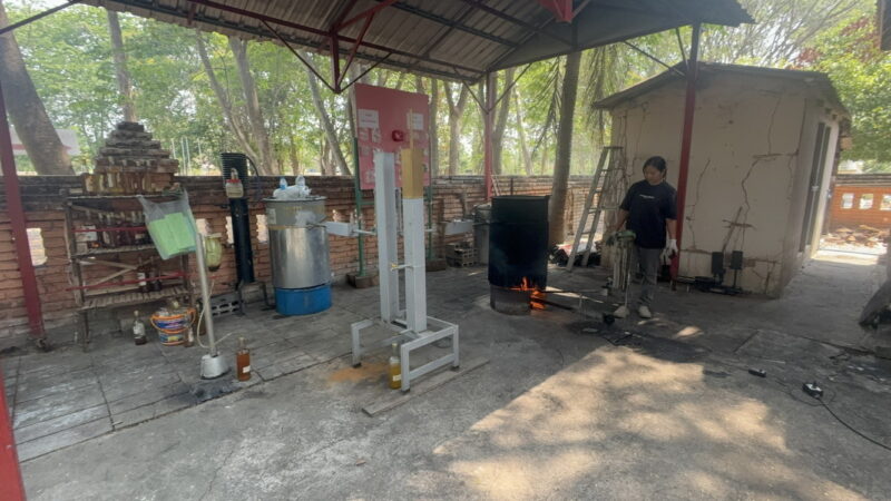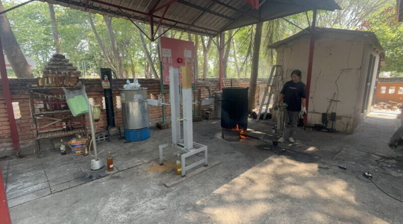 อ่างทอง – ฮือฮาวัดศุขเกษมธรรมมิการามผลิตน้ำมันจากขยะพลาสติกใช้เติมเครื่องตัดหญ้ารถจักรยานยนต์พ่วงข้างใช้งานภายในวัดมานานร่วมปีแล้ว