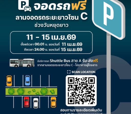 ทั้งนี้ เพื่อเป็นการช่วยบรรเทาภาระค่าใช้จ่ายของประชาชนในช่วงวันหยุดยาว ทสภ. ให้บริการจอดรถฟรี 5 วัน ตั้งแต่เวลา 00.01 ของวันเสาร์ที่ 11 เมษายน 2569 ถึงเวลา 24.00 น. ของวันพุธที่ 15 เมษายน 2569 ณ ลานจอดรถระยะยาวโซน C พร้อมจัดรถรับ – ส่ง ระหว่างลานจอดรถและอาคารผู้โดยสารทุก 15 นาที ตลอด 24 ชั่วโมง