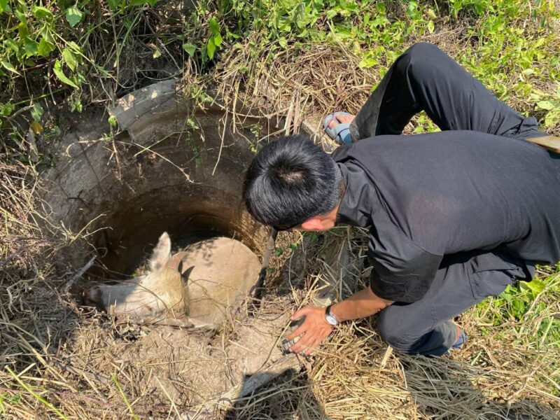 นครนายก – กู้ภัยสว่างอริยะช่วยเหลือลูกควายเพศเมียตกบ่อน้ำลึก 2 เมตร