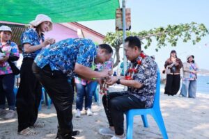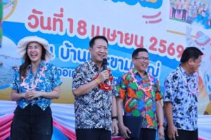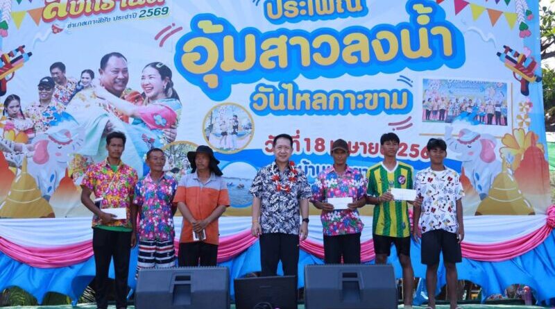 บรรยากาศบริเวณชายหาดบ้านเกาะขามใหญ่ อ.เกาะสีชัง จ.ชลบุรี กลับมาคึกคักและเต็มไปด้วยสีสันอีกครั้ง ในงานประเพณี “วันไหลเกาะขาม อุ้มสาวลงน้ำ” ประจำปี 2569 โดยนายนริศ นิรามัยวงศ์ ผู้ว่าราชการจังหวัดชลบุรี เดินทางมาเป็นประธานในพิธีเปิด พร้อมด้วยนายชุมพล ศิริครินทร์ นายอำเภอเกาะสีชัง นายสรศักดิ์ เภตรา นายกเทศมนตรีตำบลเกาะสีชัง และหัวหน้าส่วนราชการทั้งจากจังหวัดและอำเภอเกาะสีชัง ท่ามกลางเหล่านักท่องเที่ยวทั้งชาวไทยและต่างชาติที่หลั่งไหลมาร่วม