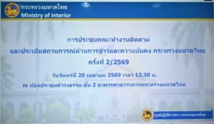วันนี้ (20 เม.ย. 69) เวลา 13.30 น. กระทรวงมหาดไทยโดยคณะทำงานติดตามและประเมินสถานการณ์ด้านการข่าวและความมั่นคง จัดประชุมคณะทำงานติดตามและประเมินสถานการณ์ด้านการข่าวและความมั่นคง กระทรวงมหาดไทย ครั้งที่ 2/2569 โดยมี นายวิรุฬห์ สิทธิวงศ์ รองอธิบดีกรมการปกครอง เป็นประธาน พร้อมกันนี้ มีคณะผู้บริหารสำนักงานปลัดกระทรวงมหาดไทยและผู้แทนส่วนราชการระดับกรมในสังกัดเข้าร่วม อาทิ นางสาวลัดดาวรรณ โชติมุณี ผู้อำนวยการศูนย์ปฏิบัติการข่าวกระทรวงมหาดไทย นางบุณฑริก หิรัญบูรณะ ผู้เชี่ยวชาญเฉพาะด้านนโยบายและยุทธศาสตร์ สำนักนโยบายและแผน สำนักงานปลัดกระทรวงมหาดไทย พร้อมผู้แทนกรมการปกครอง ผู้แทนศูนย์อำนวยการบรรเทาสาธารณภัย กรมป้องกันและบรรเทาสาธารณภัย เข้าร่วมประชุม ณ ห้องประชุมดำรงธรรม ชั้น 2 อาคารศาลาว่าการกระทรวงมหาดไทย