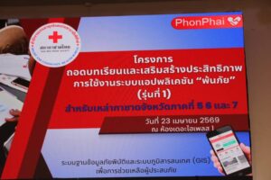วันที่ 23 เมษายน 2569 เวลา 08.45 น. ณ ห้องเดอะไฮเพลส จังหวัดร้อยเอ็ด สภากาชาดไทย โดยสำนักงานบรรเทาทุกข์ฯ จัดโครงการถอดบทเรียนและเสริมสร้างประสิทธิภาพการใช้งานระบบ “พ้นภัย” สำหรับเหล่ากาชาดจังหวัด ภาคที่ 5, 6 และ 7 (รุ่นที่ 1)