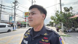กู้ภัยพัทยา หวิดคอขาดขี่ จยย.ถูกสายอินเทอร์เน็ตห้อยกลางถนนเกี่ยวคอรถล้มเจ็บสาหัส