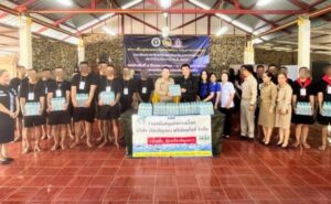 และร่วมรับมอบน้ำดื่ม จำนวน 20 แพ็ค และน้ำแข็ง จำนวน 2 ถังใหญ่ จากนายพนมชัย พันธุ์พุฒิ ผู้แทนจากบริษัท เกียรติมุกดา พรีเมี่ยมไอซ์ จำกัด หรือ โรงน้ำแข็ง เกียรติมุกดา