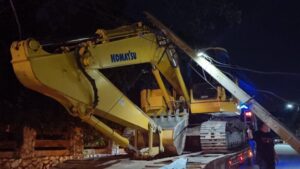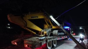 ที่เกิดเหตุ พบรถบรรทุกพ่วง 18 ล้อ ยี่ห้อมิตซูบิชิ ทะเบียน 84-5279 ชลบุรี บริเวณด้านท้ายบรรทุกรถแม็คโครมา โดยแขนของรถแม็คโครได้เกี่ยวสายไฟฟ้า จนเป็นเหตุให้เสาไฟฟ้าล้มลงมาทับตัวรถ ทรัพย์สินของทางราชการได้รับความเสียหาย