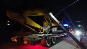 สัตหีบ รถบรรทุก 18 ล้อ บรรทุกแม็คโครเกี่ยวสายไฟ เสาไฟล้มกลางชุมชน