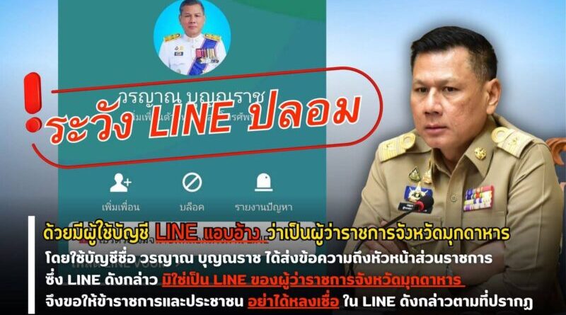 ผู้ว่าราชการจังหวัดมุกดาหาร เปิดเผยว่า ได้รับแจ้งจากหัวหน้าส่วนราชการในพื้นที่ว่า มีบัญชีแอปพลิเคชันไลน์ใช้ชื่อ
