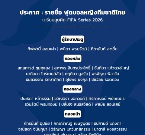 กีฬาข่าวทั่วไปพาดหัวข่าว มีนาคม 26, 2026 admin ประกาศ : รายชื่อ 26 แข้ง ฟุตบอลหญิงทีมชาติไทย เตรียมลุยศึก FIFA Series 2026 ที่ประเทศไทย ประกาศ : รายชื่อ 26 Read More